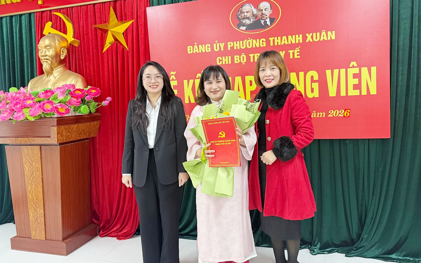 Đồng chí Huỳnh Thị Dung - Bí thư Chi bộ, Trưởng Trạm Y tế phường Thanh Xuân và đồng chí Nguyễn Hồng Nhung - Chuyên viên Ban xây dựng Đảng Đảng ủy phường Thanh Xuân trao Quyết định kết nạp Đảng cho đồng chí Trần Thị Hồng