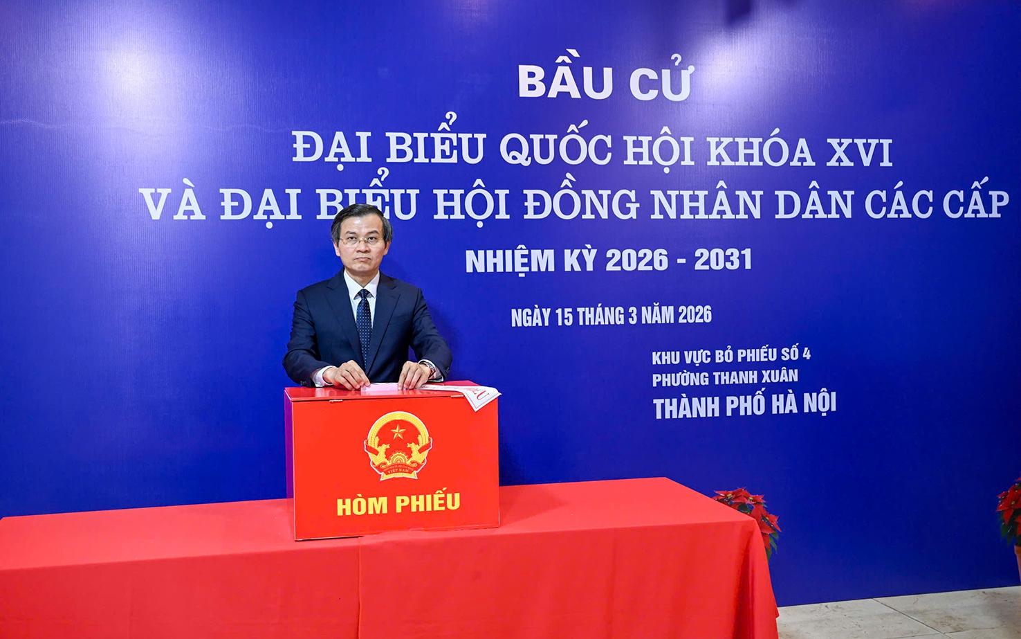 Đồng chí Đoàn Minh Huấn - Ủy viên Bộ Chính trị, Bí thư Đảng ủy, Giám đốc Học viện Chính trị quốc gia Hồ Chí Minh; đồng chí Hồ Đức Phớc - Phó Thủ tướng Chính phủ; đồng chí Trương Hải Long - Thứ trưởng Bộ Tư pháp; đồng chí Nguyễn Hải Trung - Thứ trưởng Bộ Dân tộc - Tôn giáo; đồng chí Nguyễn Mạnh Cường - Phó Chủ nhiệm Ủy ban Pháp luật và Tư pháp của Quốc hội; đồng chí Trần Đình Cảnh - Ủy viên Ban Thường vụ Thành ủy, Trưởng ban Nội chính Thành ủy; đồng chí Nguyễn Xuân Lưu - Ủy viên Ban Thường vụ Thành ủy, Phó Chủ tịch UBND Thành phố; đồng chí Nguyễn Huy Cường - Bí thư Đảng ủy, Chủ tịch HĐND phường Thanh Xuân tham dự lễ khai mạc và bỏ phiếu cùng cử tri tại khu vực bỏ phiếu số 4 - Khu đô thị Royal City.