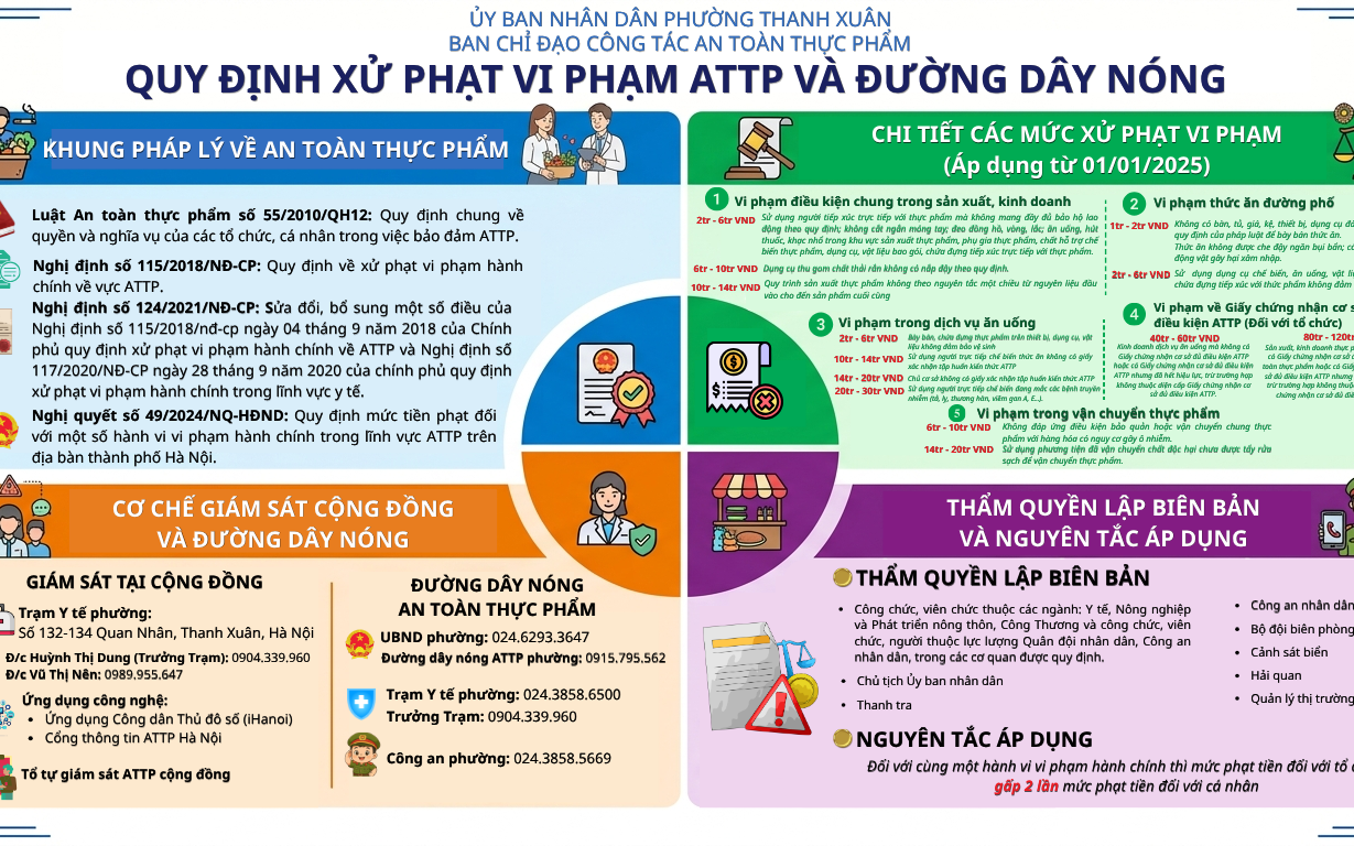 Để tăng cường công tác quản lý nhà nước về vệ sinh an toàn thực phẩm (ATTP), UBND phường Thanh Xuân đã chính thức công bố bảng hướng dẫn chi tiết về khung pháp lý, các mức xử phạt vi phạm hành chính và cơ chế giám sát cộng đồng.